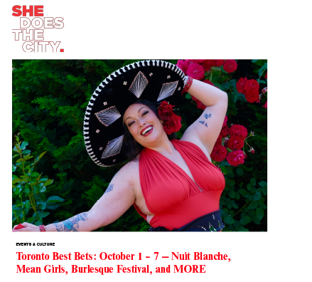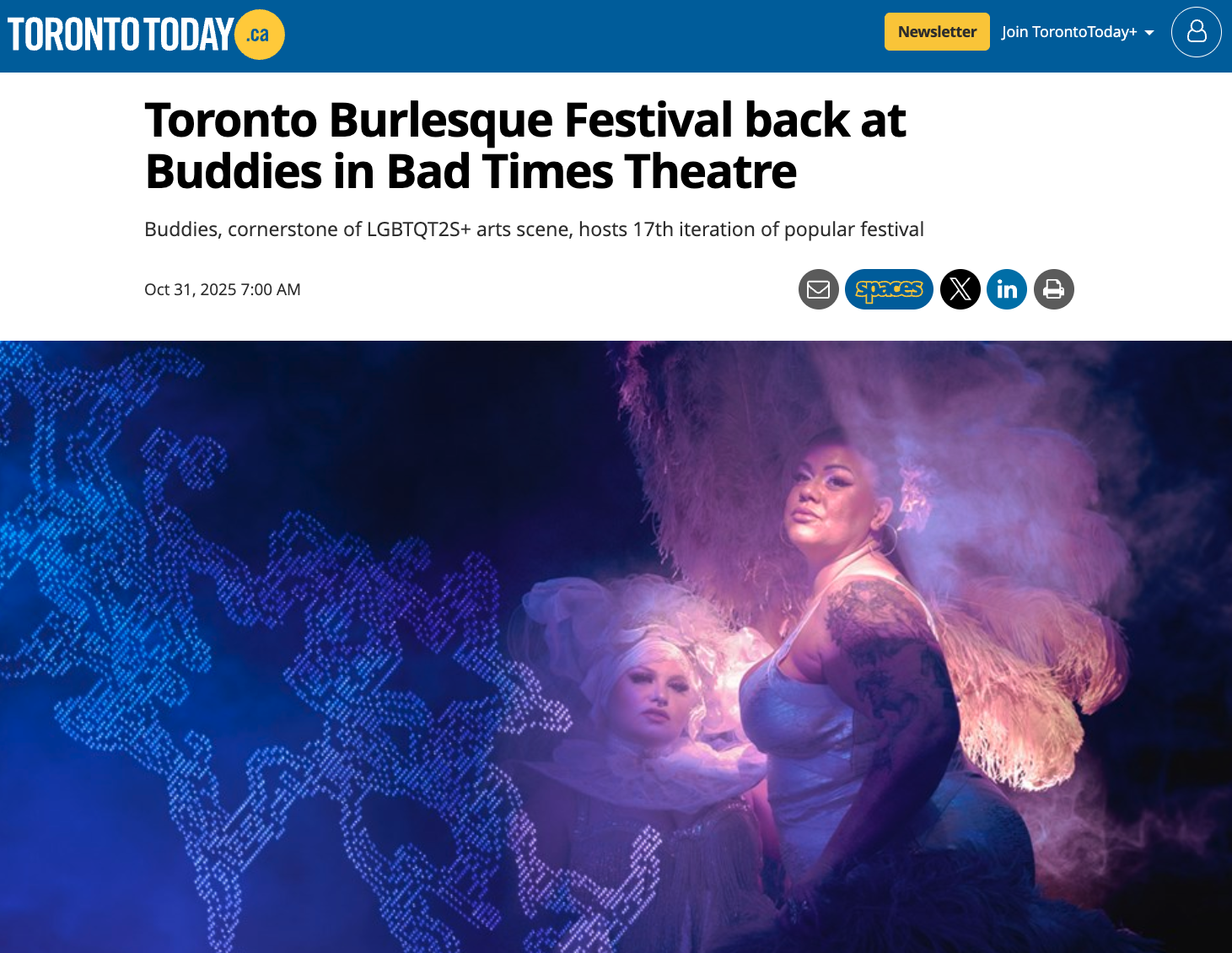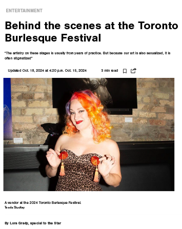 TBF Media Coverage CP24 Breakfast- “Toronto Burlesque Festival returns for 17th year” (2025) Now Magazine - “Toronto Burlesque Festival is returning to Buddies in Bad Times Theatre, bringing even more glitter, glam, and ghouls” Toronto Star - “Behind the Scenes at the Toronto Burlesque Festival” CP24 Breakfast - “Toronto burlesque festival runs this weekend” (2024) She Does the City - “How I Embraced the Body Positive Art of Burlesque” Toronto Today - Toronto Burlesque Festival back at Buddies in Bad Times Theatre Radio-Canada - Le téléjournal Ontario (en français, TBF discussed starting at 18:26) Toronto Star - “Male performers strip away expectations of burlesque” She Does The City - “Toronto Best Bets: October 1 – 7 — Nuit Blanche, Mean Girls, Burlesque Festival, and MORE”